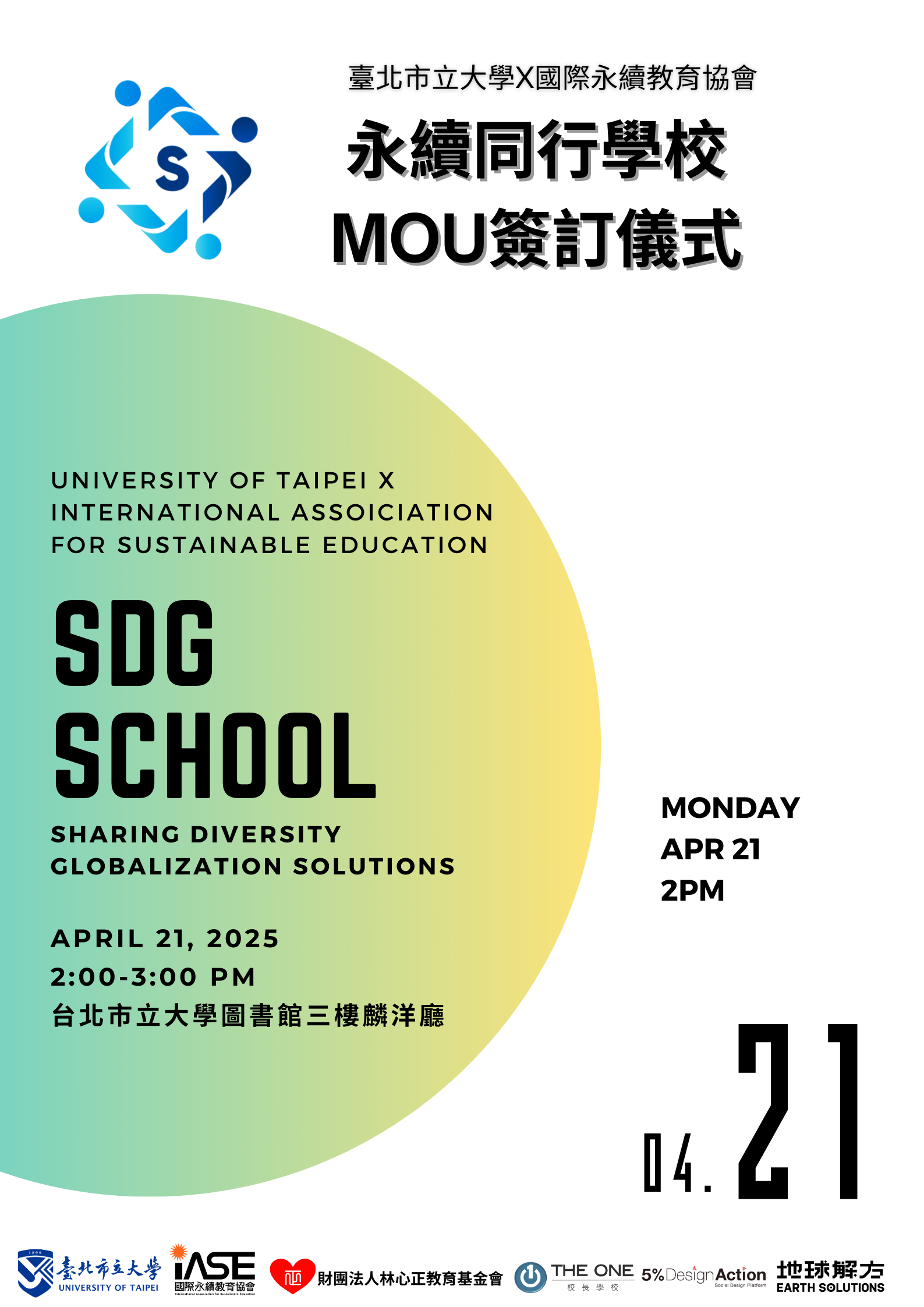 【公告】永續同行學校MOU簽訂儀式,謹訂於 114 年 4 月 21 日 (一) 辦理,歡迎踴躍參加!