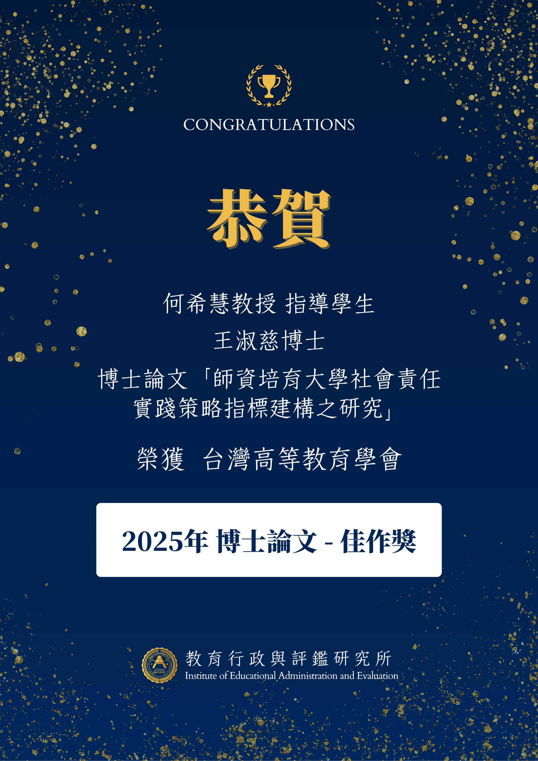 【恭賀】本所 何希慧教授 指導學生 王淑慈博士 榮獲台灣高等教育學會 2025年博士論文 - 佳作獎!