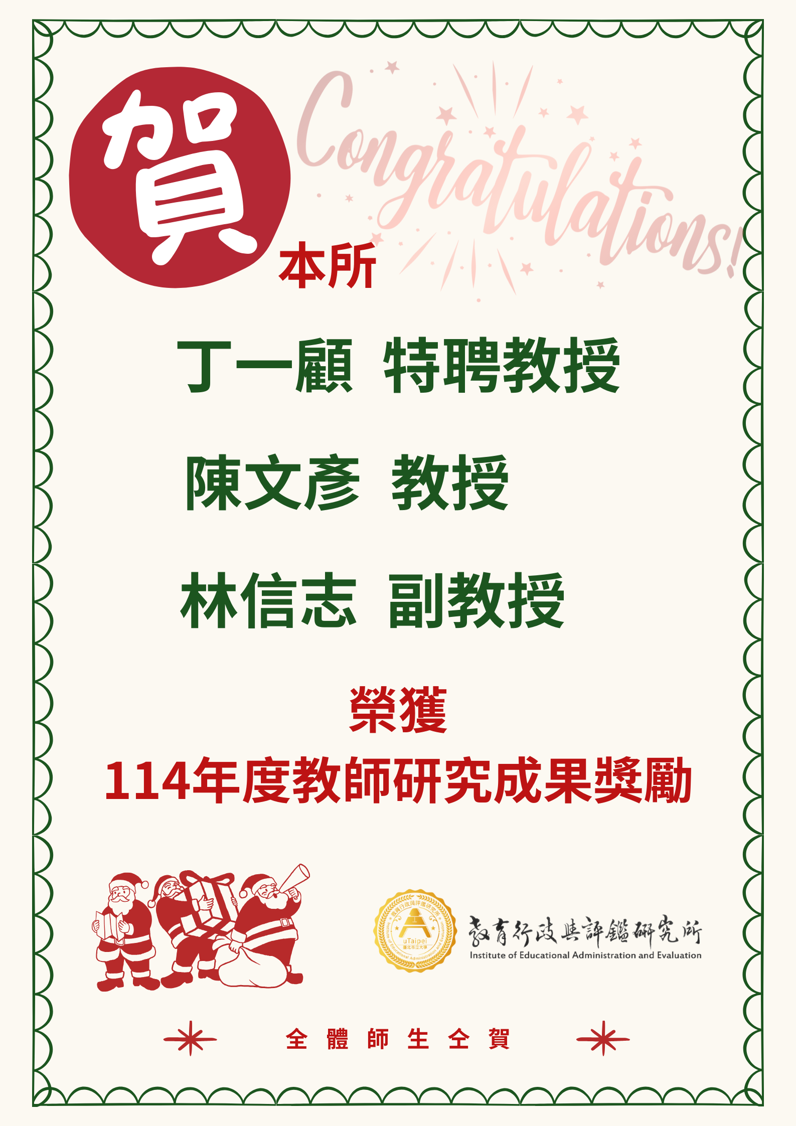 【恭賀】本所丁一顧教授、陳文彥教授、林信志副教授榮獲114學年度研究成果獎勵