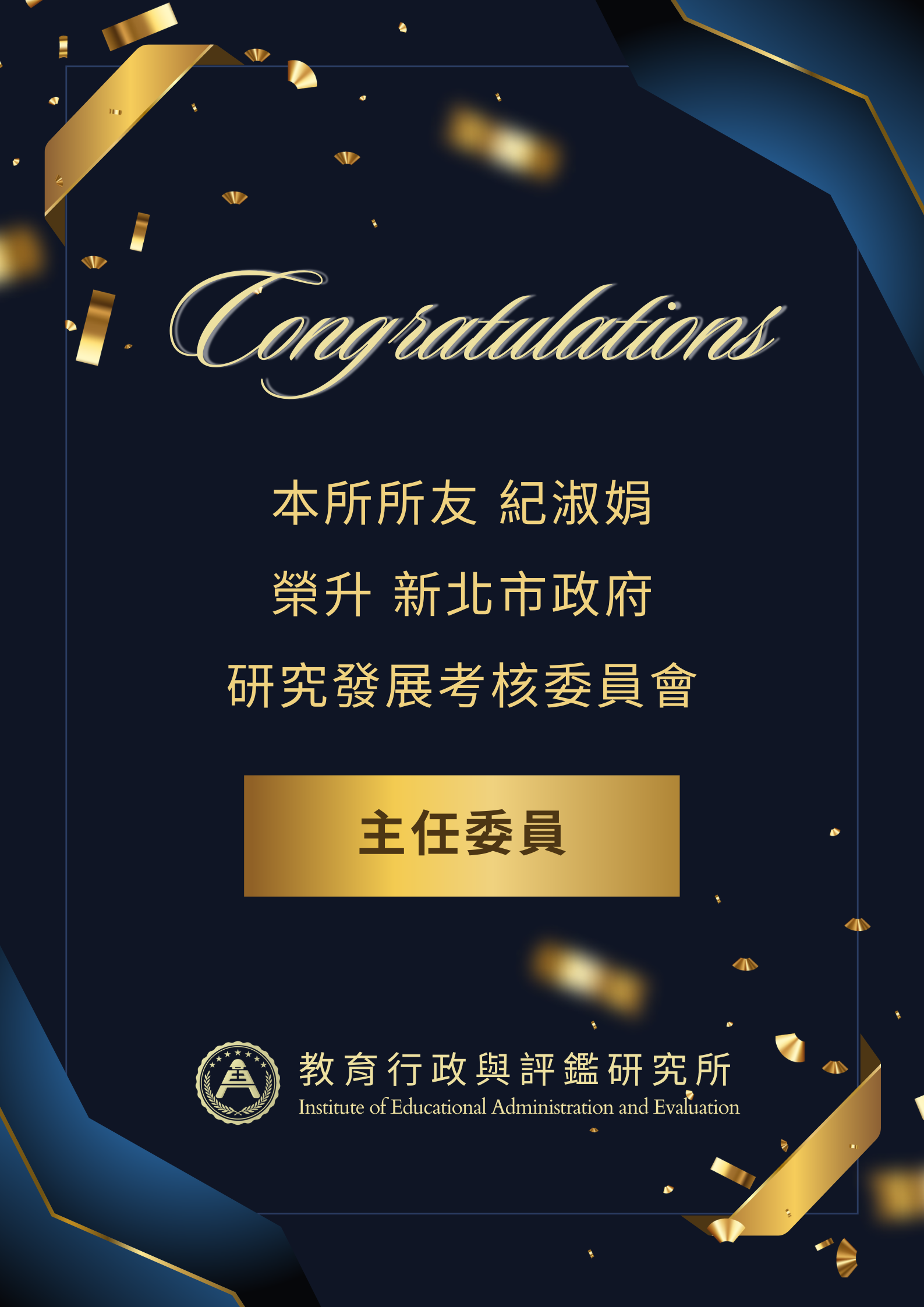 <![CDATA[教育行政與評鑑研究所 - 最新消息]]> utf-8 2026-04-24 00:43:42 2026-04-24 00:43:42 <![CDATA[【恭賀】本所所友 紀淑娟 榮升 新北市政府研究發展考核委員會主任委員!]]>